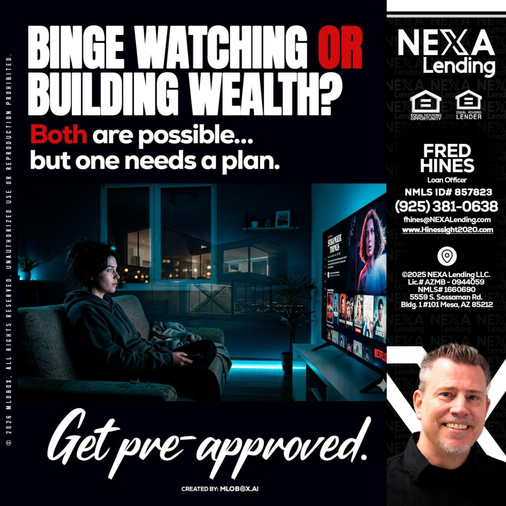 BINGE WATCHING - Fred Hines -Loan OfficerHi, my name is Fred Hines. I’m a Loan Officer with NEXA Lending LLC., offering personalized mortgage solutions, fast customized quotes, great rates and service with integrity.