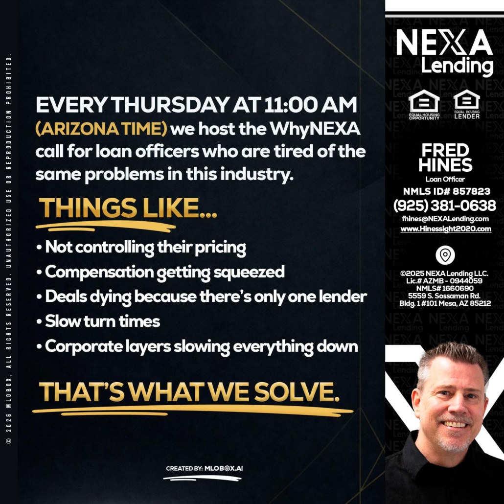 Hi, my name is Fred Hines. I’m a Loan Officer with NEXA Lending LLC., offering personalized mortgage solutions, fast customized quotes, great rates and service with integrity.