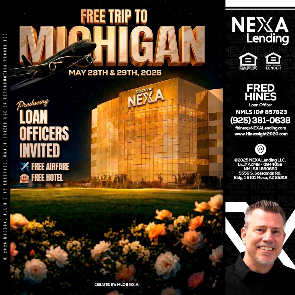 FREE TRIP TO MICHIGAN - Fred Hines -Loan OfficerHi, my name is Fred Hines. I’m a Loan Officer with NEXA Lending LLC., offering personalized mortgage solutions, fast customized quotes, great rates and service with integrity.