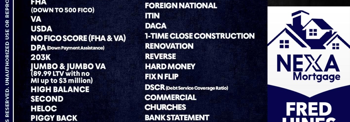 Hi, my name is Fred Hines. I’m a Loan Officer with NEXA Mortgage LLC., offering personalized mortgage solutions, fast customized quotes, great rates and service with integrity.