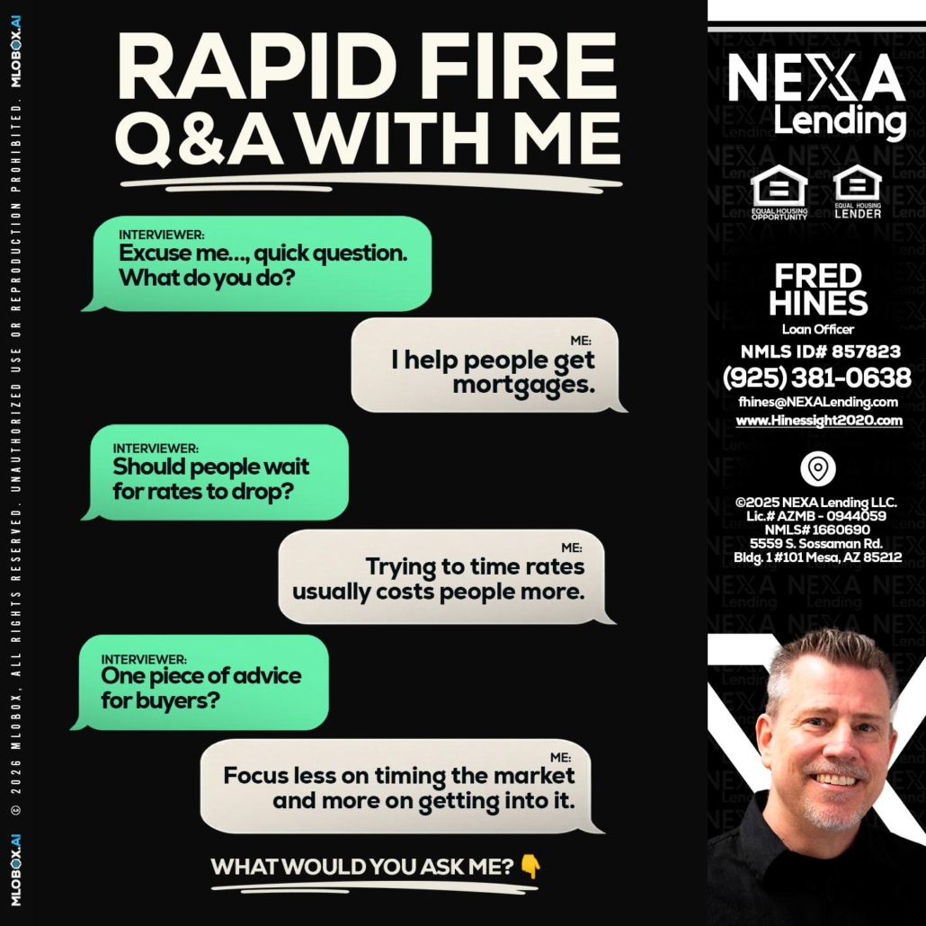 rapid fire - Fred Hines -Loan OfficerHi, my name is Fred Hines. I’m a Loan Officer with NEXA Lending LLC., offering personalized mortgage solutions, fast customized quotes, great rates and service with integrity.